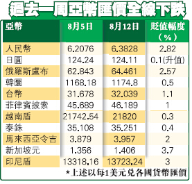 記者韓濠昕報道:受人民幣調整中間價新機制影響,亞洲各經濟體貨幣大受波動。過去一周,以新加坡元貶值幅度最大,一周兌美元劇貶3.7%,下跌到5年來最低點;印尼盾貶3%,俄羅斯盧布貶2.57%,馬來西亞令吉亦貶2%。越南盾亦曾一度大貶,其後越央行出招令匯價回穩。