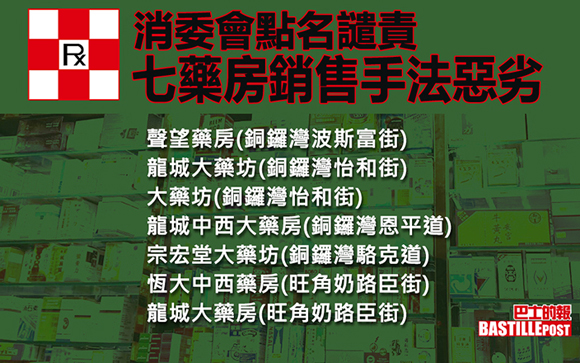 被點名的藥房包括銅鑼灣波斯富街的聲望藥房、怡和街的龍城大藥坊、大藥坊、恩平道的龍城中西大藥房、駱克道的宗宏堂大藥坊、旺角奶路臣街的恆大中西藥房及龍城大藥房。