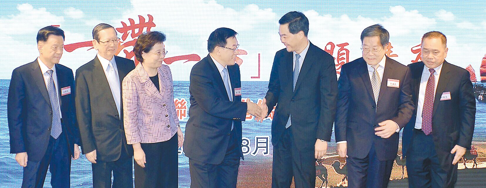 中華全國歸國華僑聯合會及香港僑界社團聯會昨日早上舉辦「一帶一路」專題講座,行政長官梁振英、國家發展改革委員會秘書長李樸民、香港僑界社團聯會會長余國春等約300人出席。