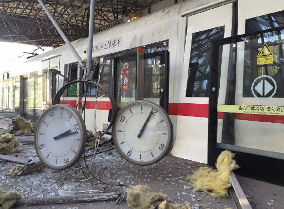 輕軌列車停在廢棄的地鐵站,從頂棚掉下的時鐘指針指向12點和12點02分。(鳳凰網馮中豪)