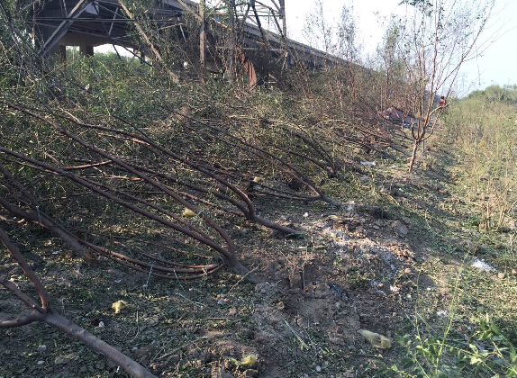 在爆炸現場,燒焦的樹呈放射狀倒在地上。(鳳凰網馮中豪)