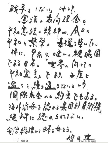 前首相羽田孜說,“不戰”是日本二戰后和平憲法的最高理念,締造了戰后日本的和平與繁榮。禁止日本發動戰爭的憲法第九條,是日本“向世界發出的和平宣言,也是日本向國際社會承諾不會重蹈覆轍”。解禁集體自衛權意味著日本能向海外派兵,因而必須“堅決反對”。“讓我們阻止安倍首相,保護日本,”他呼吁道。