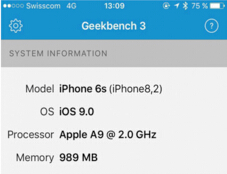 Geekbench 3的跑分畫面截圖了,跑分機型即傳說中尚未發布的iPhone 6s,運行iOS 9系統,處理器為蘋果A9,內存赫然寫著989MB RAM。是不是很憂桑?