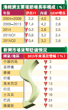 最新數據顯示,美國、歐元區及日本等發達經濟體的進口需求持續不振。自2012年第二季始,進口需求就維持在零增長附近;2014年第三季後,需求更以雙位數速度急劇下滑,導致亞洲區出口量紛紛下挫。新加坡今年第二季出口下滑4.7%,韓國下跌7.2%,臺灣更錄得近10%的低位。