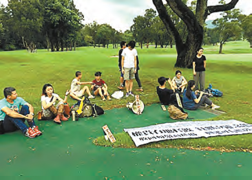 關注基層住屋聯盟、土地正義聯盟、古洞北發展關注組等多個團體,約20多名成員,昨晨到粉嶺高爾夫球場抗議,并突然越過車閘沖入球場,上址保安員雖然立即阻擋,惟未能阻止眾人,各人后來坐在高爾夫球場草地上示威,他們拉起寫著「權貴有地打波、貧無立錐之地」的橫額,不滿政府不拆球場,卻發展新界東北和迫遷居民。