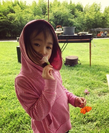 李小鹏晒父女野营照 奥莉摘花闻香初现女神样