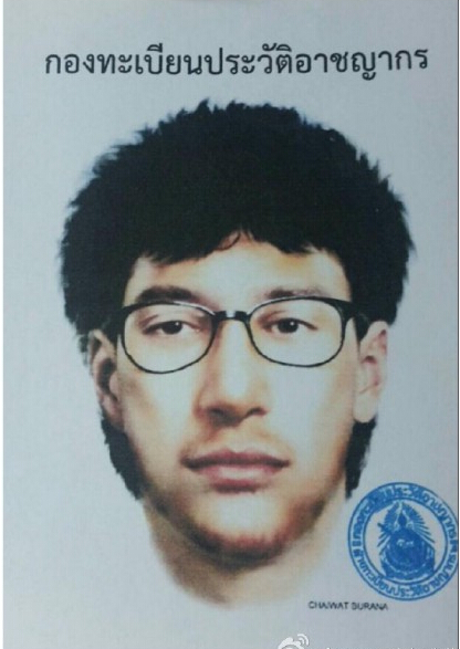 泰國警方按照爆炸現場一段監控錄像,繪制出嫌疑人的素描頭像。畫像是一名年輕男子,膚色淺,發色深,輪廓立體,有淡淡的胡渣,戴一副黑框眼鏡。警方說,繪制畫像時,還參考了一名摩的司機的意見。嫌疑人據信乘坐這名“的哥”的摩托離開爆炸現場。
