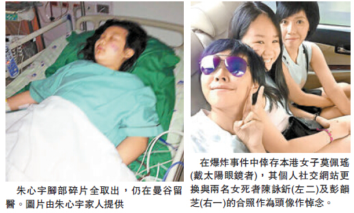 記者周偉立報道:泰國曼谷爆炸造成2名港人死亡,死者家屬完成認領遺體手續,入境處已與家屬商討盡早將遺體運返港。至於仍然留醫的5名港人中,腳部受傷的9歲女童朱心宇已成功移除全部碎片,正在深切治療部留醫,醫管局醫生今日會與院方商討何時可安排女童返港。