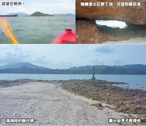 說到無人島的奇貌,Simon想起鴨螺春,「它比籃球場大少少,一邊是貝殼石灘,有一塊很大的石頭,最奇是中間通心,可望到對面鹽田港。」崩沙排則令Simon感覺趣味十足,「它有幾塊凸出的礁石,其他是平地,鋪滿貝殼,潮漲時,只有少少地方露出,面積如乒乓波,潮退後多了『幾張』。」他估計崩沙排是最小的無人島。