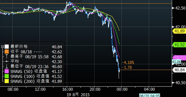 EIA數據公布后,油價下跌。美國WTI原油9月期貨價格跌破41美元關口,刷新六年半以來低位,最低至每桶40.60美元,跌幅達到4.7%。