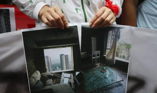8月17日,天津港“8·12”特大火灾爆炸事故,民众展示房屋受损情况。