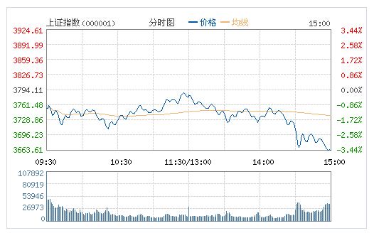 截至收盤,滬指跌3.42%報3664.29點,成交5012億元;深成指跌2.90%報12584.58點,成交4809億元。