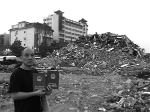 商戶方先生拿著土地證、房產證,站在被強拆的商鋪前