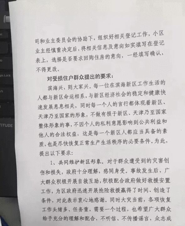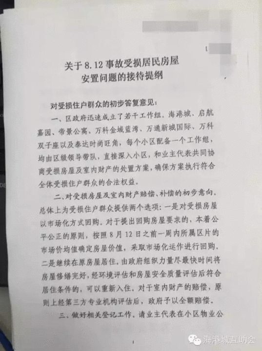 另據了解,同為距離很近的小區啟航家園處理意見與海港城一樣。爆炸周邊3公里范圍的小區,包括金域藍灣據說也是回購處理。