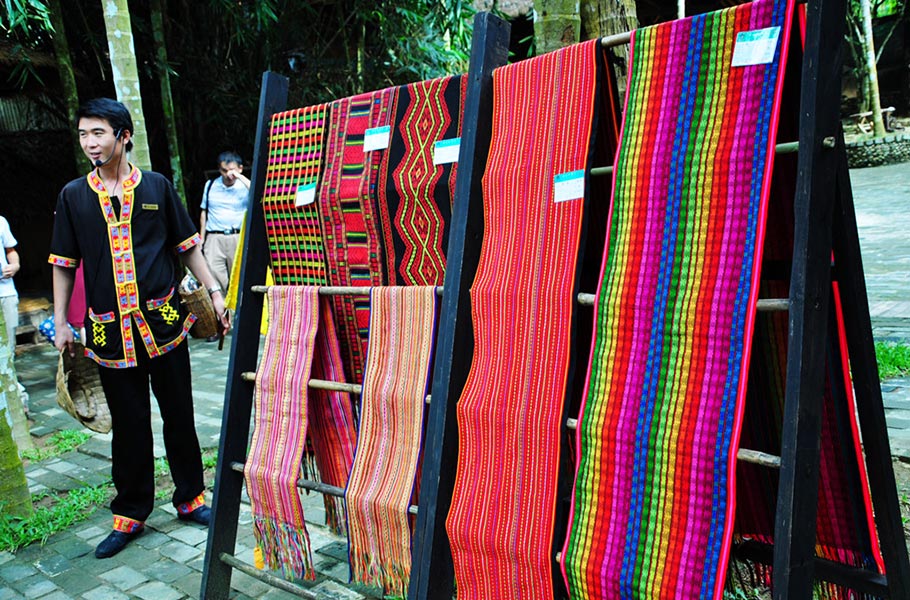 她们一直低着头做事,沉浸在色彩的美丽世界。看见我们的到来,抬起头微笑,摆出黎族人家最友好的问候:“巴农”。在她抬头的瞬间,我却在想,年轻的黎族姑娘们,又在哪里?