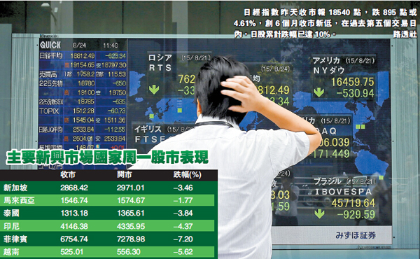 目前全球股市市值已蒸發近5萬億美元。彭博社認為,近來市場暴跌主要源於,人民幣本月上旬貶值推動了發展中國家貨幣集體下跌,市場又猜測中國經濟惡化。英國《金融時報》則提到,市場并未等來期待已久的中國央行降準這類寬松刺激,新興市場貨幣難以找到任何支撐。大宗商品持續下挫又讓印尼和俄羅斯這類依賴對華出口大宗商品的國家雪上加霜。此外,泰國商業銀行Tisco Financial Group Pcl駐曼谷的投資策略表示,原油價格下跌和本幣走弱都在重創新興市場,市場信心低下,此時不宜急於買入股票,因為糟糕的市場情緒會讓投資者難以判斷市場是否觸底。摩根士丹利近日也分析指出,聯儲偏鴿派早前的會議紀要未能刺激市場增加風險投資,所以現在要謹慎行事。大宗商品價格劇跌也說明同樣的道理。至於非大宗商品貨幣,如果相關發行國家經常項目有順差,它們會反彈。上周五,紐約輕質原油期貨價格暴跌至每桶40.04美元,創下2009年3月以來新低。巴克萊的分析師說:「全球經濟和通縮壓力依然令人擔憂,原油等商品價格依然承壓。」Leuthold Weeden Capital Management的分析預計,美股拋售潮將進一步加劇,標普500指數跌幅可能達到20%。該機構本月初就預測,隨著行業和個股從高位回撤,美股應該會大跌。如果美股加劇下跌,那麼聯儲局就可能會推遲加息。