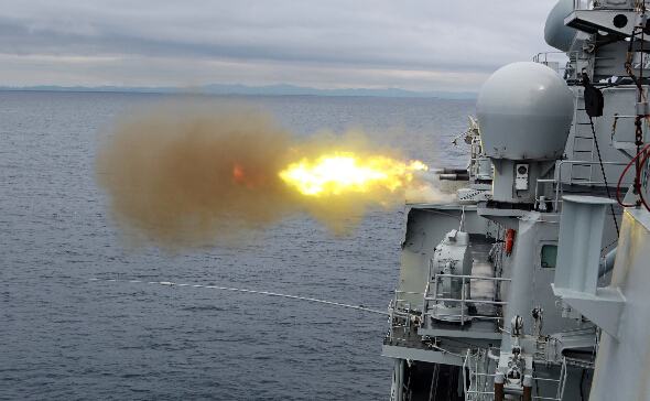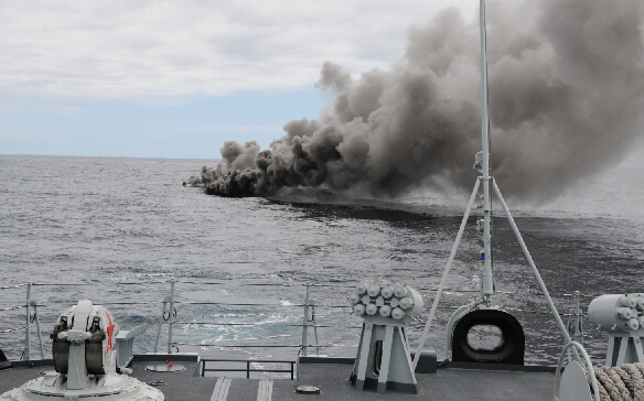 图为中国舰艇泰州舰用副炮消灭漂雷靶。