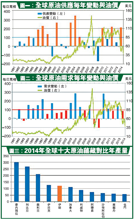 對比需求,市場更為看重需求面。圖二見到,2014年比2013年亦只增加84萬桶(紅色棒代表增幅少於100萬桶),而2013年亦只比2012年增加139萬桶,就算2007年前經濟興盛間,原油需求每年都只增加百多萬桶。同樣地,現時只是伊朗就已經能增加100萬桶,加上沙特阿拉伯及其他產油大國,需求似乎未能跟足供應增長的步伐。如斯情況下,求過於供或會逐步收窄,故現時油價又確實跌得有道理。