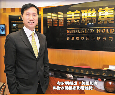 美聯物業住宅部行政總裁布少明指出,美國加息難免對本港樓市產生影響,但料影響僅屬輕微,因目前市場對加息已有心理準備,而且相信加息幅度只會介乎四分一厘至半厘之間,故相信對樓市影響不大。而供應增加,亦不會令樓市受壓,反而更有利樓市健康發展,紓緩過去樓價凌厲的升勢,但強調樓市不會有大逆轉。