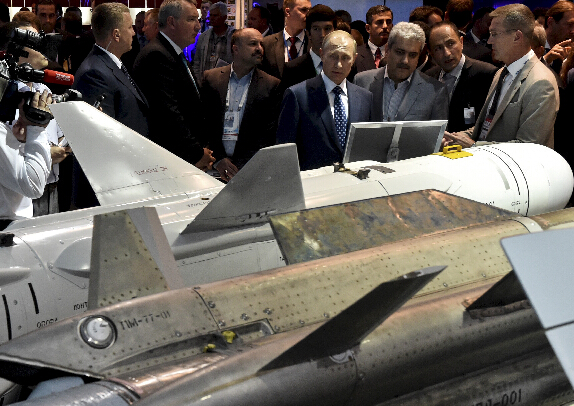在俄羅斯茹科夫斯基,俄羅斯總統普京(前右四)參觀俄羅斯國際航空航天展。
