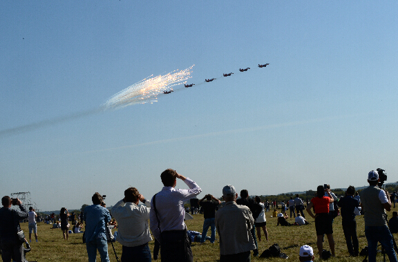 人們在第十二屆莫斯科航展上觀看飛行表演。