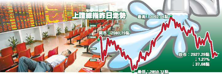 昨日滬指小幅高開,早盤兩度失守2900點,最多時跌逾4%。午後,銀行、保險板塊大幅拉升,一度反彈至近3100點,但大漲4%後掉頭向下,3000點得而復失,最終收市報2927.29點,跌37.68點或1.27%。至此,滬指連續7個交易日下跌,累跌26%,且自牛市高點回撤近45%。當日,深成指失守萬點整數位,下跌2.92%;創業板指則出現逾5%大跌,收報1890.04點。