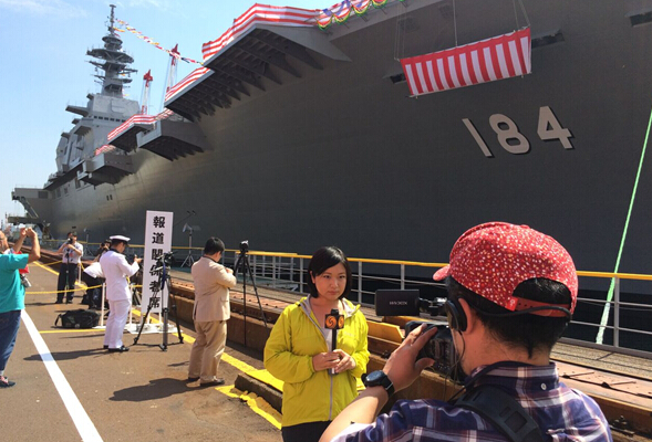 凤凰卫视作为唯一的一家外国媒体,今天采访日本准航母2号舰的命名仪式。图为凤凰卫视李淼“加贺”号直升机母舰下水仪式