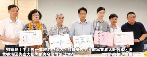 鄧家彪引述旅發局資料說,今年上半年訪港過夜旅客人數由去年1320萬人次下跌至1270萬人次,酒店平均房租由1463元下跌至1335元,入住率亦由平均89%下跌至85%——香港作為一個旅遊城市,旅客持續減少對從業員絕對是一個「惡夢」,帶來一連串的連鎖反應。