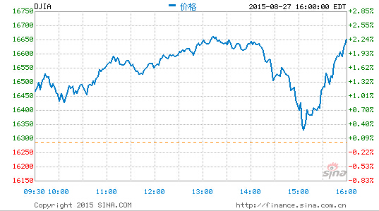 美东时间8月27日16:00(北京时间8月28日04:00),道琼斯(16654.77, 369.26, 2.27%)工业平均指数上涨369.26点,报16,654.77点,涨幅为2.27%;标准普尔500指数上涨47.15点,报1,987.66点,涨幅为2.43%;纳斯达克(4812.71, 115.17, 2.45%)综合指数上涨115.17点,报4,812.71点,涨幅为2.45%。