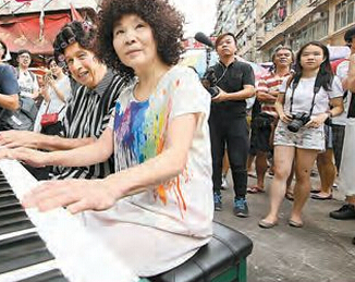 由PMQ元創方及團結香港基金主辦的「Our Hong Kong, Our Talents 同心同樂- Play Me, I'm Yours」,繼旺角街頭Jam歌及PMQ鋼琴表演后,昨日承接街頭鋼琴熱潮,特選全港最地道及具歷史背景之一的油麻地新填地街街市進行第二擊:「鬼馬街巿鋼琴騷」,邀得多位來自不同界別的名人親身到場支持,包括出名扮鬼扮馬的「蘭桂坊之父」盛智文(左)、全球「Play Me, I'm Yours」發起人著名英國藝術家Luke Jerram、及本地著名鋼琴家羅乃新(右)。活動中盛智文不忘鬼馬演出,與民同樂。