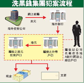 「O記」署理高級警司吳偉漢在記者會指出,該黑幫的骨幹成員指示數名基層成員在港開設公司,及開立本地銀行的綜合戶口,然後利用有關戶口收取從外地公司匯入的詐騙款項。每當數以百萬元的詐騙款項匯入戶口後,骨幹成員會在短時間內指派基層成員到銀行提取現金,或以支票形式將款項轉往其他帳戶「清洗黑錢」,估計涉案金額超過1000萬元。當中包括一間位於歐美的貿易公司報稱被詐騙集團盜用電郵,冒充公司指示銀行將超過200萬元的款項轉帳到其他戶口,並匯入該個黑幫組織成員在港開設的公司銀行帳戶及被提走。