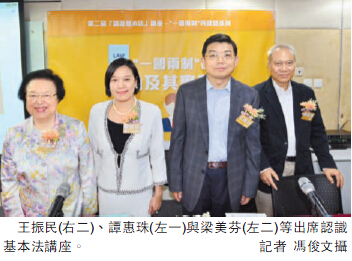 【香港商報網訊】實習記者王嘉豪報道:團體「大中華青年在線」昨午在中環中心舉辦第2屆「認識基本法」講座,邀得清華大學法學院院長王振民、基本法委員會委員譚惠珠和立法會議員梁美芬,分別就「一國兩制的內涵及其實質」發表專題演講,現場座無虛席,出席人士亦頻頻發問,氣氛良好。