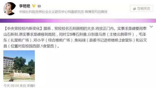 有分析人士指出,校園改造的目的是為了突出黨校的紅色傳統,是普通的校內工作,并非很多人所說的校外因素。因為按慣例,政治色彩明顯的樹立雕像儀式當有中央領導人出席揭幕。