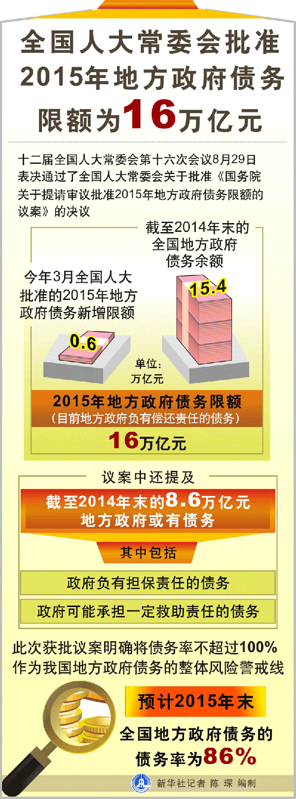 十二届全国人大常委会第十六次会议29日表决通过了全国人大常委会关于批准《国务院关于提请审议批准2015年地方政府债务限额的议案》的决议。其中外界关注的2015年地方政府债务限额锁定16万亿元,预计债务率为86%。