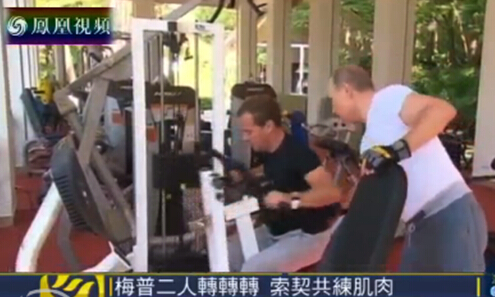 俄罗斯总统普京和总理梅德韦杰夫,30号相约在黑海度假胜地索契锻炼身体。 克里姆林宫发放片段,以强人形象示人的普京和梅德韦杰夫30号上午在索契的总统官邸,一起健身。普京练起器械来专业范十足,轮到梅德韦杰普京练起器械来专业范十足,轮到梅德韦杰夫上阵时,他还在一旁指导。
