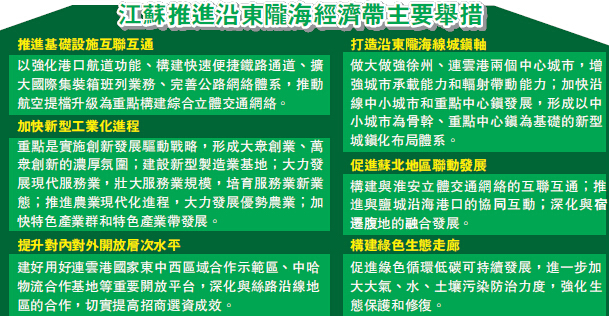 江蘇省過去曾提出建設沿東隴海線產業帶,此次將沿東隴海線產業帶深化為沿東隴海線經濟帶,體現了從單純的產業布局調整向區域經濟整體布局優化的重要轉變,將經濟帶範圍擴大至以連雲港、徐州為核心區以及淮安、鹽城、宿遷等有著緊密聯繫更大區域,并相應增加了新型城鎮化、擴大對內對外開放、注重環境保護等內容。同時,重申了江蘇「一帶一路」《實施方案》中關於連雲港和徐州兩市的戰略定位、重點任務、政策措施、目標節點等重要表述,結合沿東隴海線經濟帶在區位和資源等方面鮮明特色,提出了涉及兩市的共性任務和個性事項,并力求在政策和保障措施等方面體現傾斜支持的總體安排。