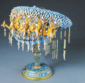 鈿后部亦有幾串流蘇垂飾。鈿又稱鈿子,是皇后、妃、嬪們平時戴的便帽。這種帽子一般用籐絲編成帽架,也有的在紙板或細鐵絲上纏繞黑色絲線為胎并編成方格紋、錢紋、盤腸等形式,再用各種寶石、珍珠嵌於帽架上,組成各種吉祥圖案。此鈿子用大珍珠50顆,二、三等珍珠幾百顆,寶石二百餘塊,珠光寶氣,珍貴豪華,主要是在吉慶場合和傳統節日時戴用的。