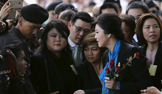 在泰国曼谷刑事法院外,英拉身穿深色套装,将就大米受贿案参加听证会。法庭外聚集着数百名支持者,包括多名泰党成员,也有些人手持鲜花,高喊英拉加油。英拉与支持者一一握手,并接过支持者给她送上红色玫瑰花。