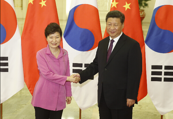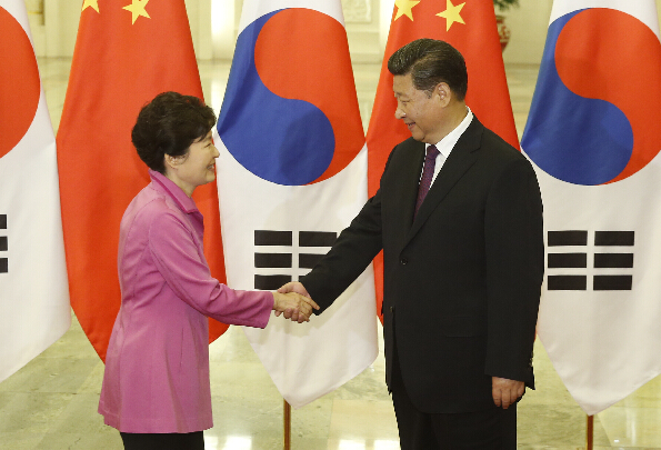 9月2日,中國國家主席習近平在北京人民大會堂會見韓國總統樸槿惠。 中新社發 杜洋 攝