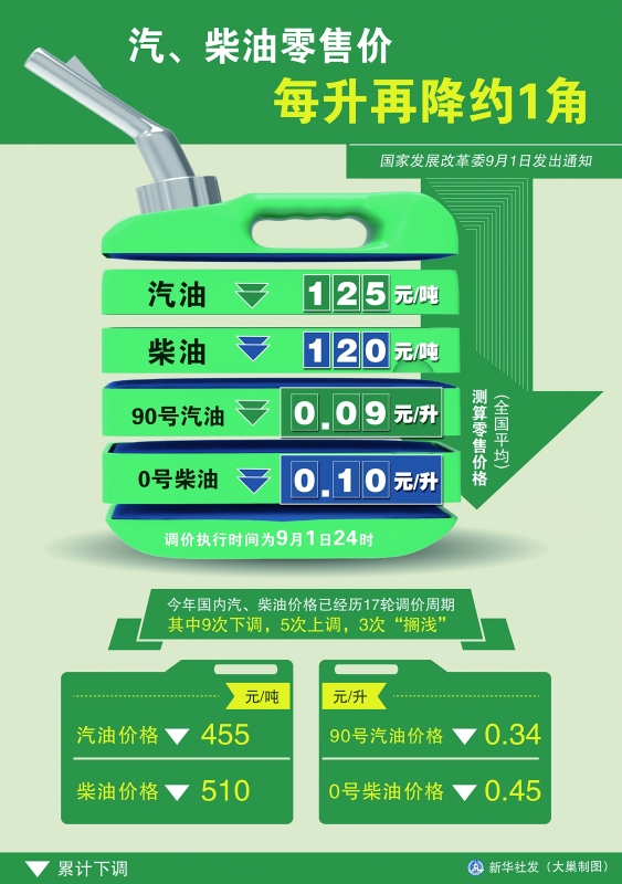昨天,國家發改委發出通知,自9月2日零時起,國內汽柴油價格每噸分別降低125元和120元,測算到零售價格90號汽油和0號柴油(全國平均)每升分別降低0.09元和0.1元。