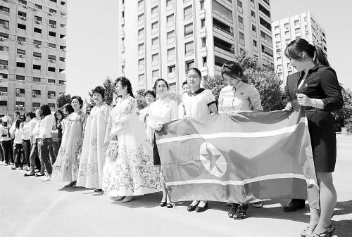 敘利亞“金日成公園”命名儀式上,參與者手持朝鮮國旗。