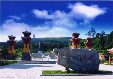走过石海,不远处就是齐鲁古战场遗址。首先是一尊将军乘车剑指敌军的铜像,凌厉之势不可挡,后有众军士铜像,夹道而站,背靠群山,气势压人。再有一亭,一古人铜像坐于其中,万丈高山为背景,饮茶之间决胜疆场,其从容稳重自不待言。