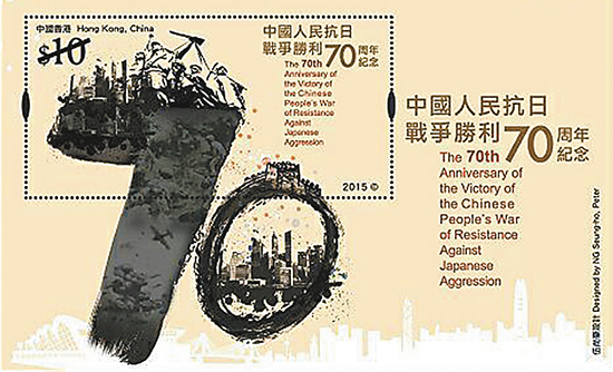 香港郵政發行的紀念郵品包括一枚面值10元郵票的郵票小型張,把當年抗日的情景與今天香港的繁華景象作對比,藉此強調和平穩定得來不易,必須好好珍惜。