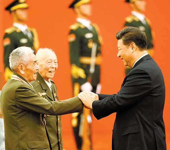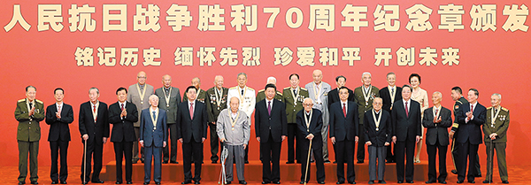 【香港商報网訊】昨日,中國人民抗日戰爭勝利70周年紀念章頒發儀式在北京人民大會堂隆重舉行。中共中央總書記、國家主席、中央軍委主席習近平向30名抗戰老戰士、抗戰將領、幫助和支持中國抗戰的國際友人或其遺屬代表頒發紀念章並發表重要講話。習近平強調,要銘記一切為中華民族和中國人民作出貢獻的英雄們,崇尚英雄,捍衛英雄,學習英雄,關愛英雄,戮力同心為實現「兩個一百年」奮鬥目標、實現中華民族偉大復興的中國夢而努力奮鬥。