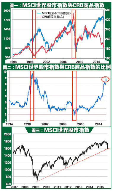 今次筆者不是用技術超買或超賣來分析後市,而是用股市與商品市場中的關連比例,因為近來坊間常言油價及其他商品近月大跌反映環球經濟前景轉壞,拖累股市大跌,意指商品與股市同向,商品不濟,股市都無運行。但股市是否一定跟商品走呢?一時是,一時不是,大時大節就是,在近廿年間,圖一見到,2002至2007年或2009至2010年的全球大升市以至2009年金融海嘯就是齊升齊跌。不過,廿多年來亦有部分時間見到兩者背馳, 2012年10月至今的股升商品跌就是好例子。
