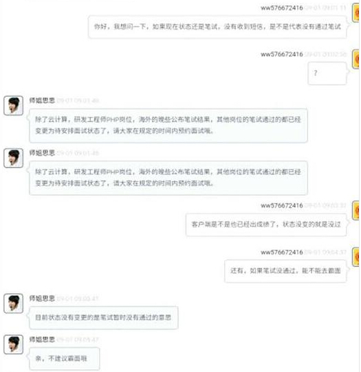 洪羽是電子商務專業大四的學生,參加阿里巴巴校招經過了筆試正在等結果。她最開始得知“縮招”的消息還是從幾個分享群里。暑期在加拿大實習的洪羽一早起床發現自己加的幾個分享群都已經吵翻了天。這時大家都在等待筆試結果發布、預約下一步面試的節點上,阿里招聘官網上卻突然發布縮招通知,緊接著就有同學在客服那證實了消息,并被告知除了技術類崗位,“網申頁面狀態仍停留在筆試階段就意味筆試沒通過”。