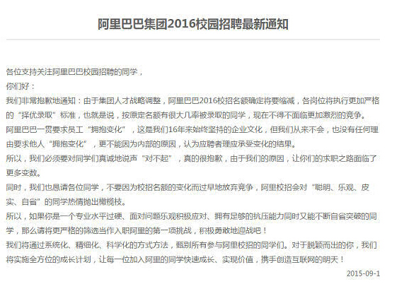 最近幾天,參加阿里巴巴2016年校招的應屆畢業生們對公司“擁抱變化”的核心價值觀有了深刻理解。就在同學們天天刷屏等待筆試結果公布的時候,阿里巴巴集團校招官網在9月1日發布通知,表示“由于集團人才戰略調整,阿里巴巴2016校招名額確定將要縮減”。接著有媒體報道招聘人數從原來的3000多人銳減到400左右,巨大的轉折讓通過各個途徑參加面試的同學遇到了意想不到的變數。