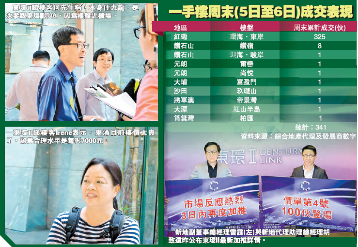 至於「環海東岸」方面,九建市務及銷售部總經理楊聰永昨日表示,環海開賣首日(5日)出售311伙,占首批368伙的85%。截至周日6時,環海單日出售14伙,累售325伙(相當首批約88%)。楊聰永又指出,非常滿意有關銷情,并料新一批單位會於短期之內加推,滿足市場需求。