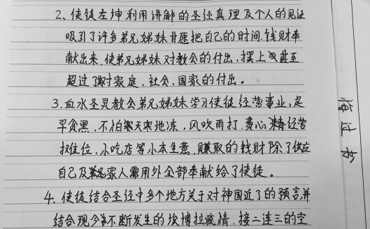 曾任“血水圣靈”河北、河南、山西“三省都督”的教會骨干,寫下悔過書與對邪教的認識。