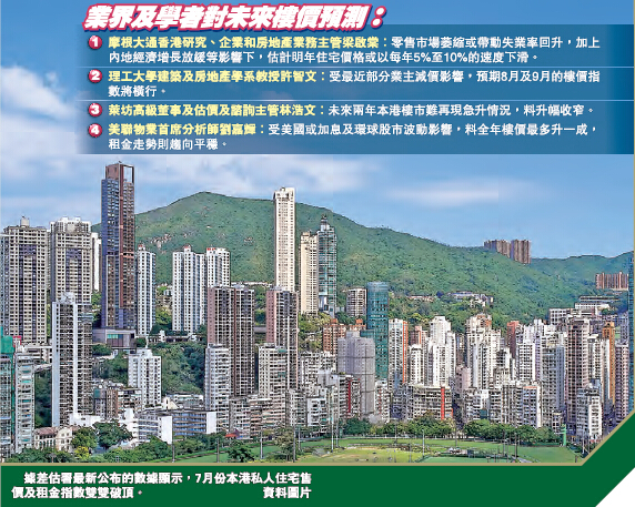 對於樓價再創新高,相信也屬市場預期之內,惟有大行指出,明天樓價升勢或將到此為止。摩根大通香港研究、企業和房地產業務主管梁啟棠表示,受累於奢侈品牌相繼關店的影響,令本地零售市場不斷萎縮,或連帶失業率向上,加上外圍不利因素,包括內地經濟增速放緩,以及美國加息對全球投資者造成沖擊等,預期樓價或由明年開始,保持每年5%至10%的速度下滑。另外,理工大學建築及房地產學系教授許智文更預期,隨著近日有部分業主實行減價沽貨,料8月及9月的樓價指數就率先向橫發展,惟他估計要令樓價指數由升轉跌,仍需待市場出現如失業率上升等負面數據。